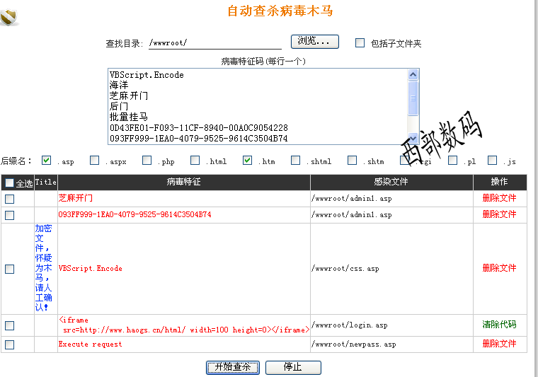 因傳統(tǒng)殺毒軟件不能有效地識別網(wǎng)頁木馬,特別是網(wǎng)頁木馬經(jīng)常被加殼或制作為變種!所以我司自主開發(fā)了專門針對網(wǎng)頁木馬的殺毒軟件,每天晚上自動掃描所有網(wǎng)站。發(fā)現(xiàn)木馬的,對該文件自動更名;發(fā)現(xiàn)iframe病毒的,對病毒代碼自動清除;并自動通過電子郵件通知你,讓您輕松掌握您的網(wǎng)站情況