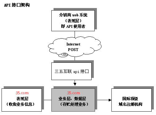 API接口(https://api.35.cn/api/)是基于三五互聯(lián)業(yè)務(wù)系統(tǒng)開發(fā),集域名注冊(cè)、虛擬主機(jī)、企業(yè)郵箱、云服務(wù)器的實(shí)時(shí)購買開通API程序接口。 分銷商自行開發(fā)web平臺(tái),獨(dú)立擁有域名主機(jī)管理、數(shù)據(jù)管理、客戶管理等平臺(tái)。 三五互聯(lián)作為上游注冊(cè)服務(wù)商僅提供基于一定技術(shù)標(biāo)準(zhǔn)下的API接口調(diào)用程序服務(wù)。