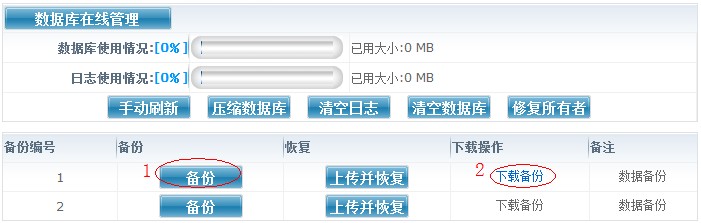 3、mssql數(shù)據(jù)庫備份(若沒有sqlserver數(shù)據(jù)庫請?zhí)^) 登錄我司網(wǎng)站,點擊“業(yè)務管理”——“mssql數(shù)據(jù)庫”——“管理”,進入數(shù)據(jù)庫在線管理,點擊“備份”按鈕將數(shù)據(jù)庫備份為bak文件,再點擊“下載備份”,可以將備份文件下載到您本地或服務器。如圖: