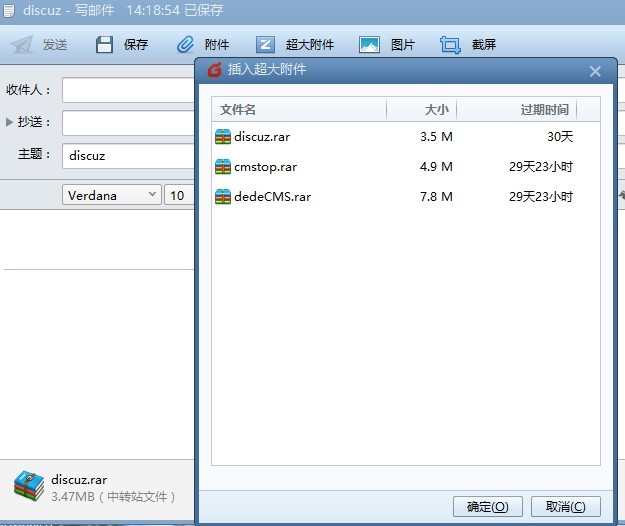 如何提升海外郵件的發(fā)信成功率?如果是發(fā)到國外hotmail,gmail等郵局因我方IP被封、IP發(fā)信頻率太高等 原因 被對方拒收的,系統(tǒng)會自動通過其他中繼自動嘗試,以此提升發(fā)信成功率。 但以下情況不會使用中繼(退信中提示...not use rely 的):郵箱設(shè)置了自動回復(fù)、自動轉(zhuǎn)發(fā)、被監(jiān)控的,或郵件內(nèi)容大于5M的 . 為了使用海外中繼功能,建議關(guān)閉自動回復(fù)、自動轉(zhuǎn)發(fā)、取消監(jiān)控,大于5M的郵件請按以下方式使用Foxmail的超大附件功能發(fā)送。 使用超大附件功能時,實際郵件內(nèi)容會小于5M,這樣就能繼續(xù)使用中繼轉(zhuǎn)發(fā) 2. 進(jìn)入寫郵件時,點(diǎn)擊“超大附件”,會提示您綁定QQ郵箱或者騰訊企業(yè)郵箱。我們綁定一個QQ郵箱即可。