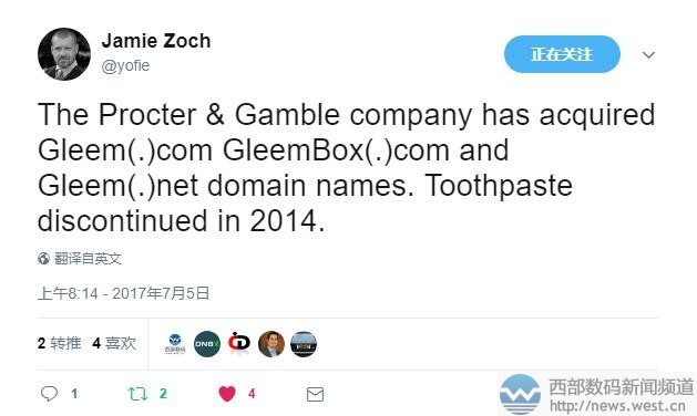 寶潔公司收購整套gleem相關(guān)域名!格利姆牙膏欲重出江湖?三五互聯(lián)(35.com)7月6日消息,據(jù)知名投資人Jamie Zoach曝料稱,全球最大的日用消費(fèi)品公司——寶潔,近日一舉收購了gleem.com/.net以及gleembox.com三枚域名。有意思的是,gleem.com對應(yīng)的寶潔旗下牙膏品牌,早在2014年便被寶潔公司放棄了。