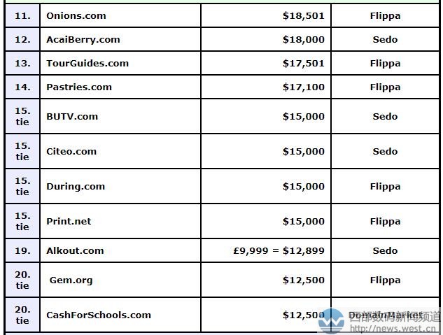 另外,緊隨其后的域名routes.com也拍出25,0000美元價格,該域名是“路徑、路途”的意思,可搭建旅行相關(guān)平臺。其他域名,比如 “快活”Bouncy.com、vxe.com、“水上巴士”waterbus.com、“洋蔥”O(jiān)nions.com、“打印、印刷”Print.net等也以不錯價格成交。