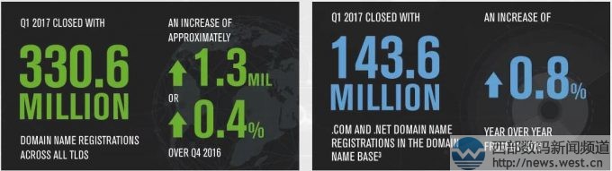 威瑞信發(fā)布2017年一季度域名行業(yè)簡報三五互聯(lián)(35.com)7月19日消息,域名運營注冊局威瑞信今天對外發(fā)布2017年第一季度域名注冊量簡報,報告稱今年一季度所有國際頂級域名注冊總量達3.306億個,其中截至到2017年3月31日,新增注冊量為130萬個,同比增長3.7%,環(huán)比增長0.4%。