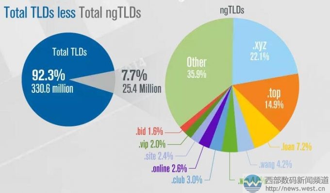 截至到今年3月31日,新頂級域名全球注冊量總量達2540萬,占全球域名注冊總量的7.7%。而排名前10的新頂級域名注冊量又占全球新頂級域名注冊總量的64.1%。其中,排名第一的是.xyz域名,占新頂級域名注冊總量的22.1%,隨后是.top域名,占全球新頂級域名注冊總量的14.9%,.loan域名、.wang域名以及.win域名分別次之。