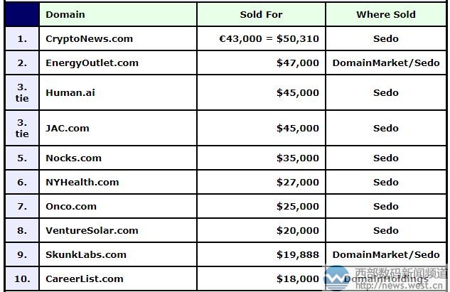 域名cryptonews.com注冊于1999年,主體由crypto和news組合而成,具有“加密消息”的意思,用來搭建網絡安全平臺比較合適。另外,今年以來加密貨幣(CryptoCurrency)等虛擬貨幣行情不錯,Crypto news也可指代加密貨幣方面的新聞,用來搭建相關資訊平臺也很合適。據查詢發現,相關域名cryptonews.biz/.org目前均已建站。 排名第二的是域名energyoutlet.com,成交價為47,000美元,約合人民幣31萬元。該域名由英文單詞“energy”(能源)和“Outlet”(出口、批發)組合而成,適合用于能源相關領域名。 本期DN榜上,國別域名human.ai表現不錯,以45,000美元的成交價躋身三強。.ai后綴原是烏拉圭國別域名,但因其與人工智能(Artificial Intelligence)相對應,后多用于人工智能領域。域名human.ai代表有“人、人類”的意思,是很常見的英語詞匯,用來搭建人工智能相關平臺價值不錯。 與Human.ai并列第三的還有三字母域名jac.com,該域名注冊于1995年3月,在中文里有“聚愛財”的含義,非常適合搭建金融理財平臺。除此以外,jac.com還對應有不少終端,比如jac江淮汽車(jac.com.cn)、JAC外貿實戰博客(jacindustry.org)、JAC服裝品牌設計(jacline.cn)等等。 除此以外,因為域名nocks.com(作凹痕于、箭扣)以35,000美元成交;組合域名nyhealth.com(紐約健康)以27,000美元成交;onco.com(致癌)成交價為25,000美元。其他域名也有不錯表現,交易詳見下圖: