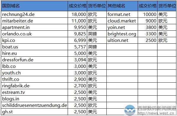 國別域名方面,兩個德國域名表現(xiàn)出眾,rechnung24.de和mitarbeiter.de分別以18,000歐元和11,000歐元結(jié)拍。其中,rechnung24.de雖是組合域名,但“rechnung”有“賬單”的意思,24又對應(yīng)有24小時,適合搭建財務(wù)票務(wù)類網(wǎng)站。域名mitarbeiter.de則表示“同事、職員、雇員”的意思,在德語里也是非常通用的詞語。 其他域名中,format.net以10,000美元節(jié)拍,主體“format”有“版式、形式、安排”等意思,目前對應(yīng)有福瑪特自行車(formatbike.cn)。另外,新頂級域名cloud.market以9000歐元成交,該域名直接代表“云市場”,對應(yīng)當前比較火熱的云技術(shù)領(lǐng)域,可應(yīng)用的空間較廣。 本文轉(zhuǎn)載自新聞資訊,原文鏈接:三字母ipb.com六位數(shù)領(lǐng)跑Sedo榜!數(shù)字域名7306.com緊隨其后