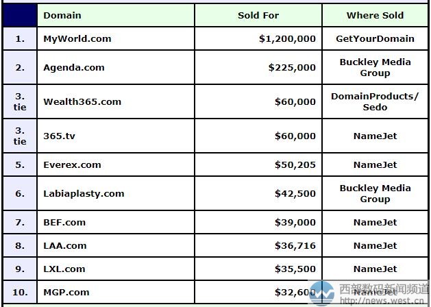 重磅:“我的世界”域名myworld.com以790萬元登頂DN榜三五互聯(lián)(35.com)10月12日消息,國內十一長假剛剛結束,國外就傳來了捷報。據(jù)最新一期的DN榜(9.25-10.8)顯示,一枚英文域名myworld.com以1,200,000美元高價結拍,約合人民幣791萬元,無懸念摘得本期DN榜桂冠。