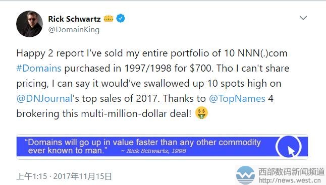 “域名大王”Rick一連出售10個三數(shù)字域名!美圖收購 “青年會所”域名三五互聯(lián)(35.com)11月21日消息,據(jù)namepros在論壇曝料稱,近日知名投資大佬“域名大王”Rick Schwartz出售了包括346.com、348.com等在內(nèi)的10個三數(shù)字域名,交易總額達數(shù)百萬美元。與此同時,美圖秀秀公司拿下了英文組合域名PartyNow.com。