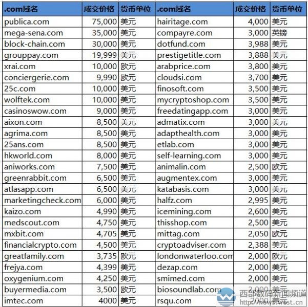 排名第二的是組合域名Mega-Sena.com,成交價(jià)為35,000美元,約合人民幣23萬元,該域名直譯為“萬塞納”,對(duì)應(yīng)有巴西一個(gè)樂透彩票網(wǎng)。同樣為扁擔(dān)域名的block-chain.com,成交價(jià)為30,000,是“區(qū)塊鏈”的意思,對(duì)應(yīng)有當(dāng)下火熱的區(qū)塊鏈行業(yè),具有不錯(cuò)的商業(yè)價(jià)值。