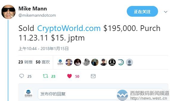 成本15美元!Mike Man以125萬元售出域名“加密世界”1月16日消息,前幾日威瑞信剛發(fā)布12月.com域名熱門注冊詞匯,“加密貨幣”cryptocurrency、“比特幣”bitcoin等詞再度上榜,連續(xù)多月成為域名注冊的風(fēng)向標(biāo)。而昨天,大佬Mike Man超百萬元售出cryptoworld.com讓“加密”域名再成焦點(diǎn)。