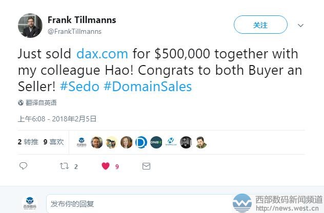 三字母域名Dax.com超300萬元高價易主!2月6日消息,昨天晚上Sedo平臺經(jīng)紀人Frank Tillmanns發(fā)推稱,與中國經(jīng)紀人同事Hao共同中介成交了一枚三字母域名Dax.com,價格為500,000美元,約合人民幣315萬元。