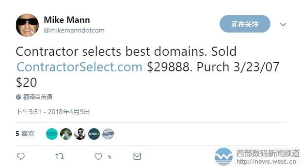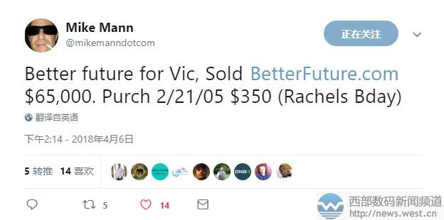 大佬Mike Mann又出米:“美好未來”域名六位數(shù)成交!成本僅350美元!4月10日消息,就在幾小時前,國外域名大佬Mike Mann發(fā)推稱,以29,888美元出售了英文組合域名contractorselect.com,約合人民幣18.8萬元。另外,前兩天Mike Mann還以65,000美元售出了域名betterfuture.com,也再次讓大家見識了大佬不凡的銷售能力。