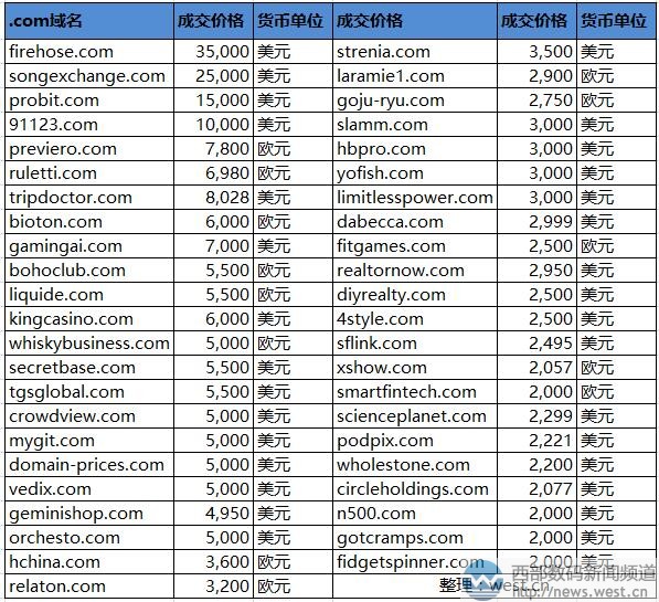 按照慣例,我們還是先來看.com域名。本期sedo榜上,成交價最高的com域名來自英文域名firehose.com,交易價為35,000美元,約合人民幣27萬元。該域名屬于行業(yè)詞匯,直譯為“消防水帶”,目前對應(yīng)有前端開發(fā)公程師培訓(xùn)平臺Firehose Project,官網(wǎng)域名為thefirehoseproject.com。 緊隨其后的也是一枚英文組合域名songexchange.com,該域名由“song”(歌曲)和exchange(切換)組合而成,成交價為25,000美元,約合人民幣19萬元,很適合搭建音樂類軟件平臺。 除此以外,域名probit.com和91123.com分別以15,000美元和10,000美元成交。前者對應(yīng)一種廣義上的線性模型——probit模型;后者是五數(shù)字域名,屬于硬通貨,在建站方面沒有限制。