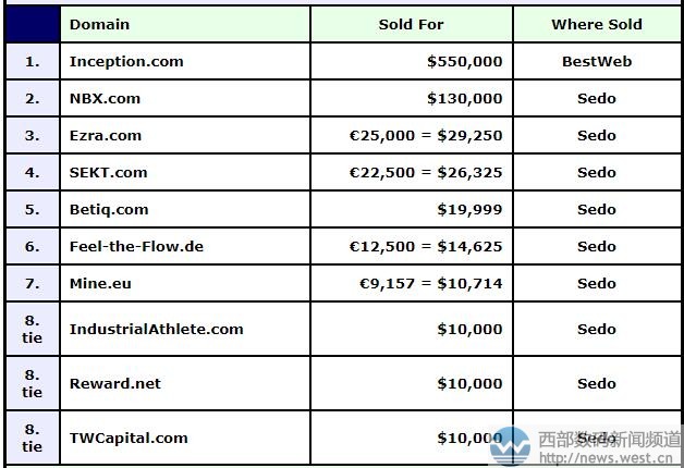 昂貴的“開(kāi)端”:英文域名inception以366萬(wàn)元居DN榜首7月13日消息,新一期的DN域名交易榜昨天出爐,本期榜單上超六位數(shù)美金成交的域名有兩枚,分別是inception.com(550,000美元)和NBX.COM(130,000美元)。