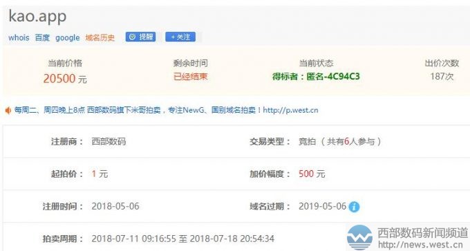 單拼域名kao.app在三五互聯(lián)五位數(shù)結(jié)拍!7月20日消息,.app域名自開(kāi)放注冊(cè)以來(lái),其受關(guān)注的程度一直居高不下,相關(guān)域名交易案例也時(shí)常傳出。據(jù)三五互聯(lián)最近成交記錄顯示,多枚.app域名完成交易,其中單拼域名kao.app以20,500元競(jìng)拍,雙拼域名haoqing.app則以10,000元一口價(jià)被秒。