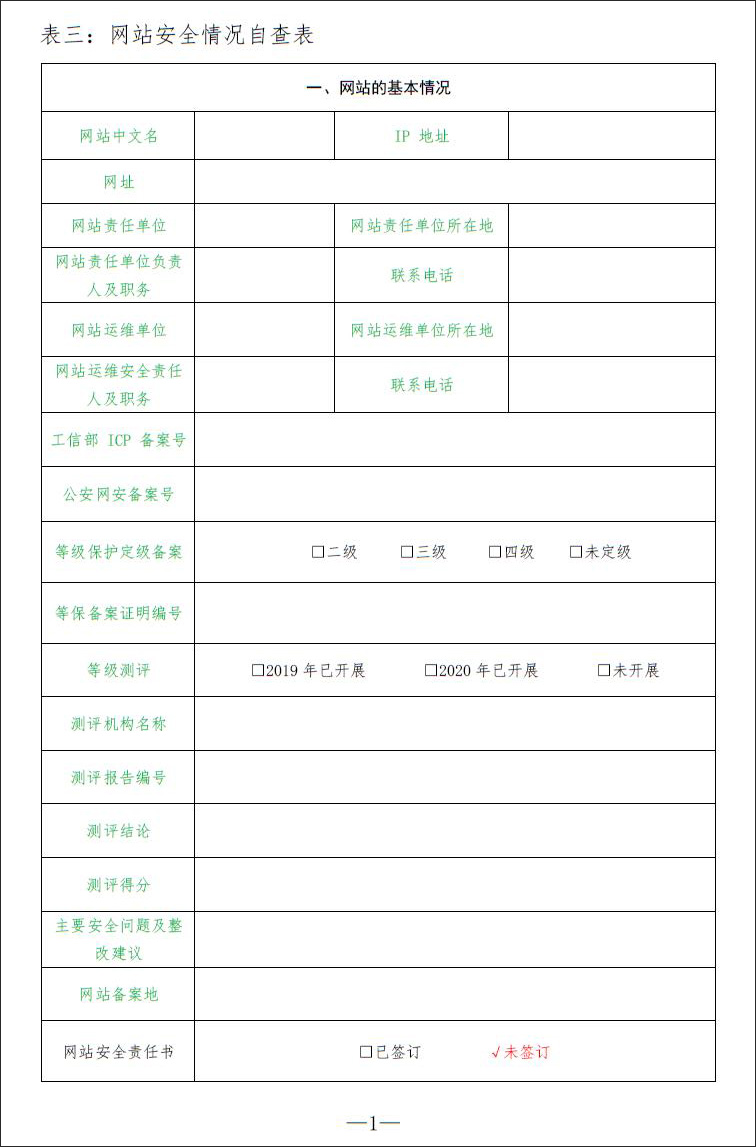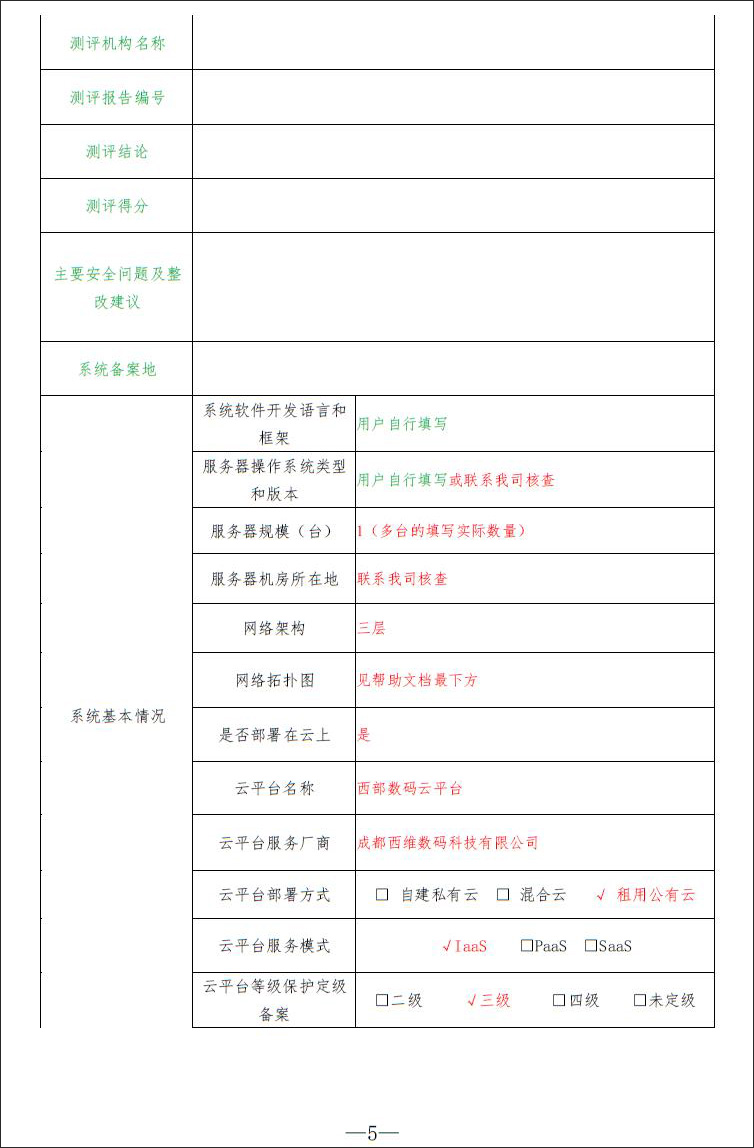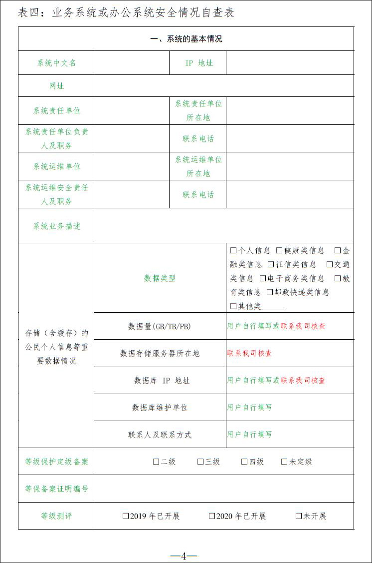 2020 年公安機關網(wǎng)絡安全監(jiān)督檢查自查表-填表說明此填表說明適用于《2020 年公安機關網(wǎng)絡安全監(jiān)督檢查自查表》紙質(zhì)版和《2020 年公安機關網(wǎng)絡安全監(jiān)督檢查自查采集工具》的填寫。 >>>填表說明: 1、如果您的單位不是行業(yè)主管部門或者網(wǎng)絡運營者,不用填寫“表一:行業(yè)主管部門填寫”和“表二:網(wǎng)絡運營者填寫”,直接選擇表三或表四填寫。 2、如果您使用的是虛擬主機請升級為云主機,然后填寫。虛擬主機不適用于本表填寫。 3、圖中綠色的部分,需要用戶自行填寫,紅色的部分請參照頁面文字填寫,需聯(lián)系我司核實的信息請?zhí)砑游宜驹诰客服QQ 800019263 聯(lián)系售后咨詢或提交工單咨詢。
