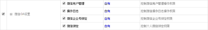 微信OA能設(shè)置哪些權(quán)限?與微信OA有關(guān)的權(quán)限共4個:微信用戶管理、操作日志、微信企業(yè)號綁定、微信綁定 如圖所示,其中"微信綁定"權(quán)限提供給個人,進(jìn)行個人微信號的綁定,可分配給每個用戶,另外三個權(quán)限開通給進(jìn)行微信OA設(shè)置和管理的用戶即可(如下圖)。