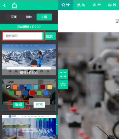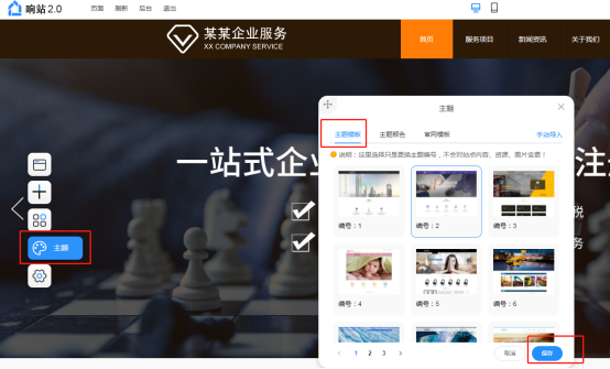 (1)設(shè)計(jì)界面,點(diǎn)擊左側(cè)浮窗“主題”,在彈出的主題彈窗,第一個(gè)選項(xiàng)卡“主題模板”,可更換您的主題,選中后點(diǎn)擊右下角保存,將更換您的主題樣式(不會(huì)覆蓋數(shù)據(jù))