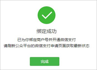 目前僅支持綁定主體一致且完成所有開(kāi)戶(hù)流程的新接口普通類(lèi)型商戶(hù)號(hào),其他類(lèi)型均不支持,詳情如下: 1)商戶(hù)號(hào)與appid的認(rèn)證主體不一致; 2)商戶(hù)號(hào)未走完所有開(kāi)戶(hù)流程,包括未驗(yàn)證身份、未簽署協(xié)議等情況; 3)商戶(hù)號(hào)是老tenpay接口的商戶(hù)號(hào),未完成新接口升級(jí); 4)商戶(hù)號(hào)是境外類(lèi)型商戶(hù)號(hào); 5)商戶(hù)號(hào)是服務(wù)商類(lèi)型商戶(hù)號(hào); 6)商戶(hù)號(hào)因違規(guī)處罰導(dǎo)致的限制; 另外,選擇該種方式請(qǐng)確認(rèn)你的業(yè)務(wù)模式和經(jīng)營(yíng)范圍是否與“綁定的商戶(hù)號(hào)”一致。如不一致,請(qǐng)走新申請(qǐng)流程獲取新的商戶(hù)號(hào)。 3、驗(yàn)證成功后,將會(huì)進(jìn)入綁定成功頁(yè);你可通過(guò)該商戶(hù)號(hào)進(jìn)行微信支付的開(kāi)發(fā),通過(guò)該商戶(hù)號(hào)進(jìn)行收款。看到綁定成功提示后,你的微信支付功能已成功開(kāi)通,請(qǐng)刷新公眾平臺(tái)的微信支付申請(qǐng)頁(yè)獲取最新?tīng)顟B(tài)。如下圖所示: