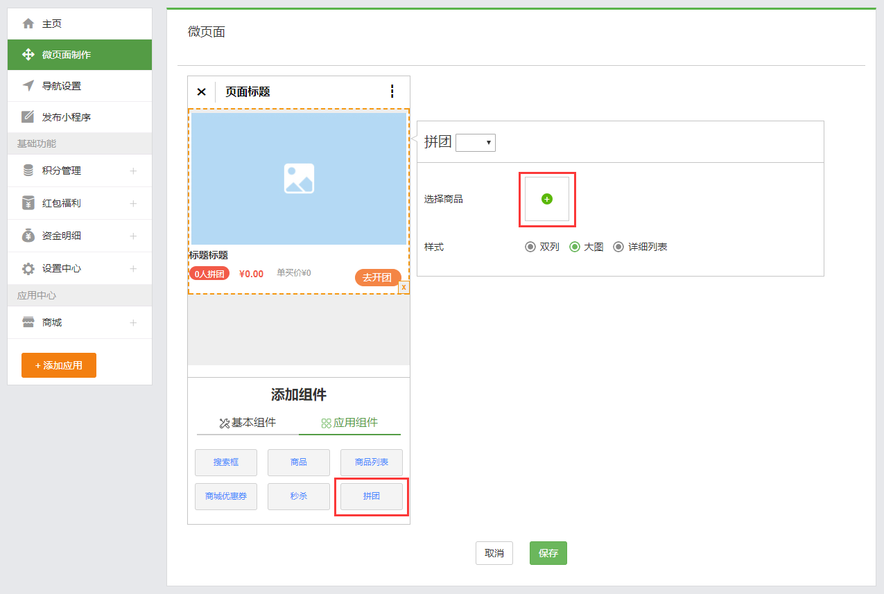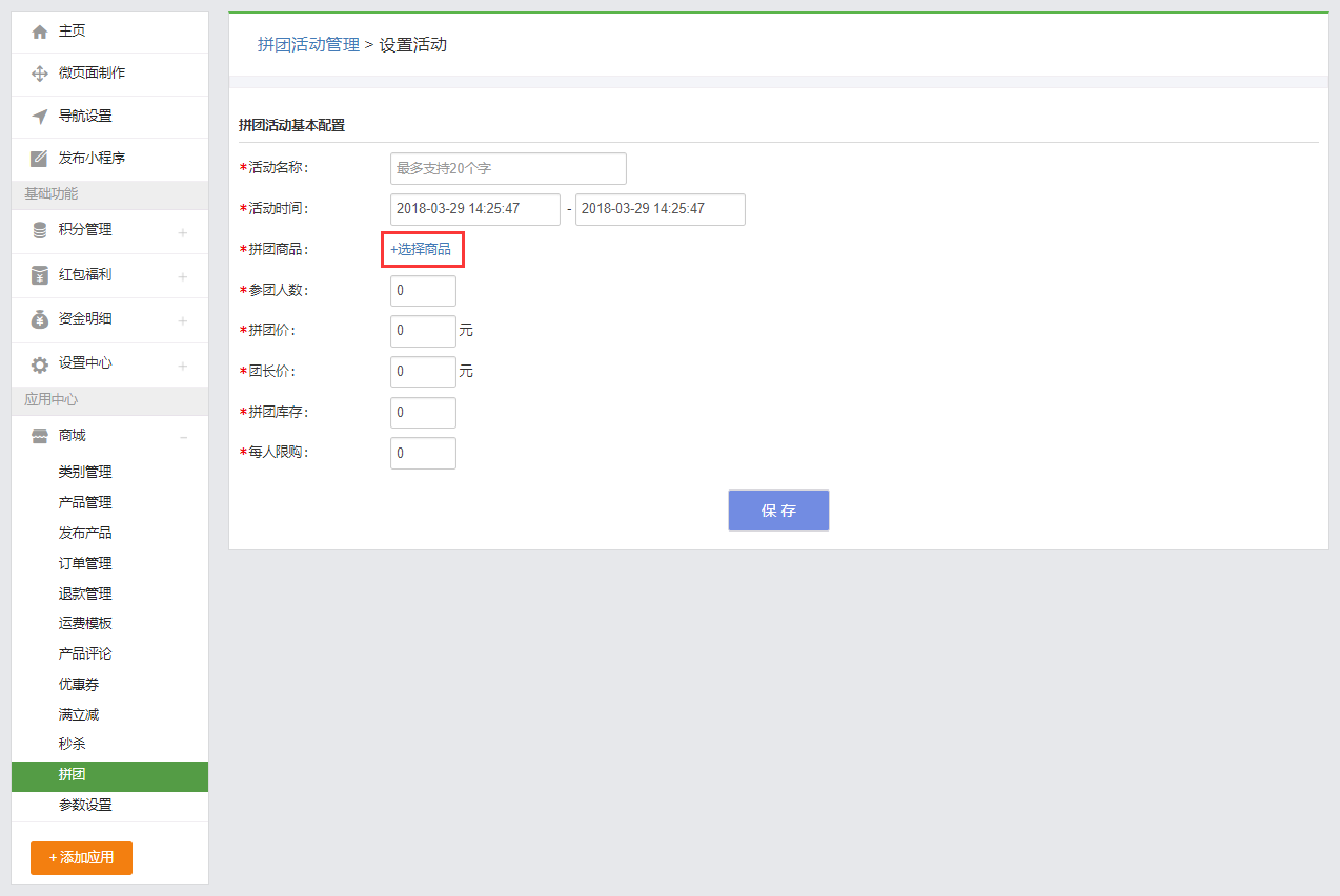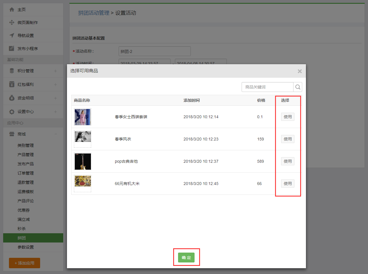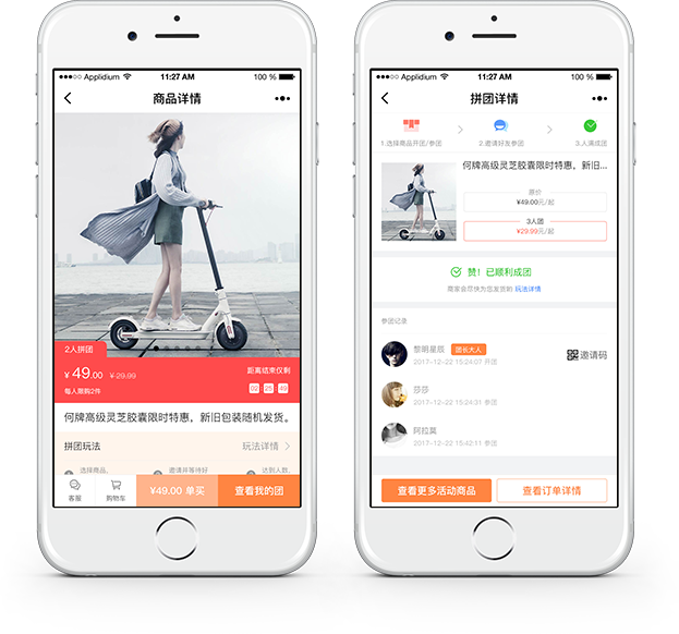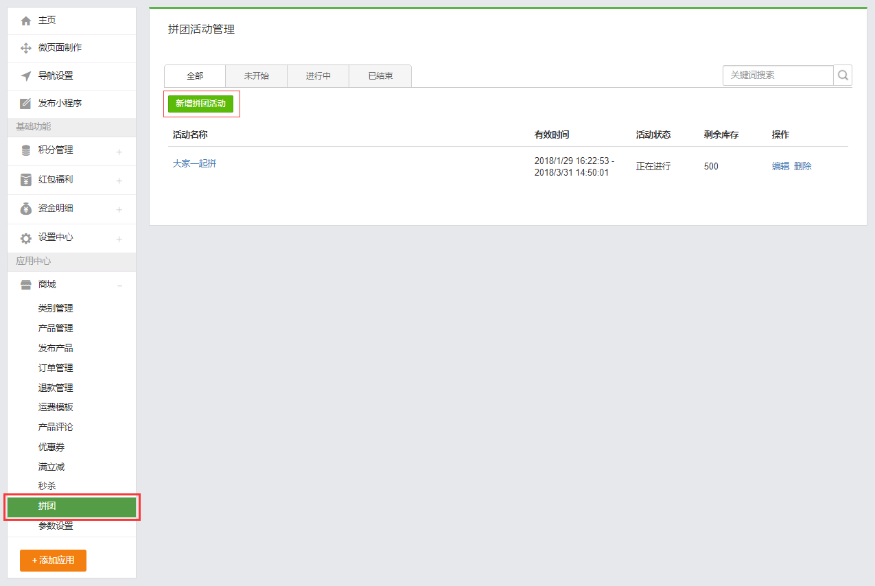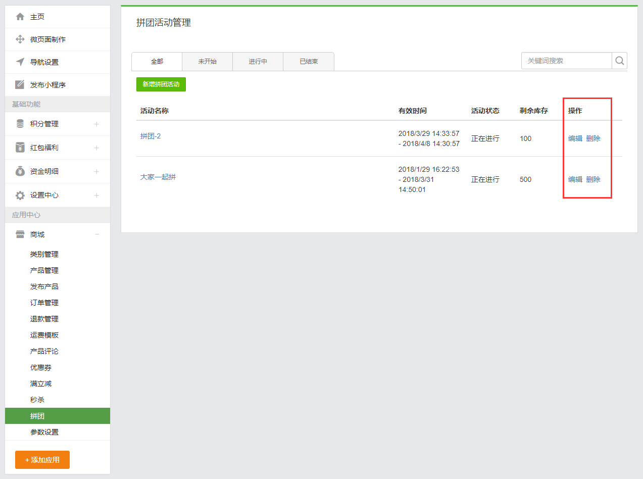 拼團(tuán)拼團(tuán)一、功能說(shuō)明“拼團(tuán)”功能是由商家針對(duì)特定商品,在約定時(shí)間內(nèi),以成團(tuán)人數(shù)為條件,用優(yōu)惠價(jià)格出售商品的營(yíng)銷活動(dòng)。商家可在后臺(tái)自行設(shè)置拼團(tuán)商品、拼團(tuán)價(jià)格、活動(dòng)時(shí)效、參團(tuán)人數(shù)及活動(dòng)商品限購(gòu)等信息。通過(guò)鼓勵(lì)買(mǎi)家發(fā)起拼團(tuán),邀請(qǐng)好友以折扣價(jià)格購(gòu)買(mǎi)優(yōu)質(zhì)商品,同時(shí)給店鋪帶來(lái)更好的傳播效果。 二、操作步驟步驟一:設(shè)置拼團(tuán)活動(dòng) 1、在小程序管理后臺(tái),點(diǎn)擊“商城-拼團(tuán)”進(jìn)入拼團(tuán)頁(yè)面進(jìn)行添加和編輯; 2、點(diǎn)擊【新建拼團(tuán)活動(dòng)】按鈕跳轉(zhuǎn)到拼團(tuán)活動(dòng)基本配置頁(yè)面,填寫(xiě)基本參數(shù); 3、點(diǎn)擊【選擇商品】按鈕,在彈出的彈框中選擇已發(fā)布的商品,若還未發(fā)布任何商品, 請(qǐng)點(diǎn)擊“商城-發(fā)布產(chǎn)品”在該頁(yè)面發(fā)布產(chǎn)品(具體操作步驟詳見(jiàn)產(chǎn)品發(fā)布與管理); 4、填寫(xiě)完參數(shù)之后和選擇好商品之后,點(diǎn)擊【保存】按鈕,即可查看到剛剛創(chuàng)建好的拼團(tuán)活動(dòng),還可對(duì)該拼團(tuán)活動(dòng)進(jìn)行編輯和刪除的操作。 步驟二:在微頁(yè)面里面添加拼團(tuán)組件1、當(dāng)創(chuàng)建好拼團(tuán)活動(dòng)后,如何讓它顯示在小程序中呢? 這時(shí)候就需要用到 微頁(yè)面里面的拼團(tuán)組件。當(dāng)用戶開(kāi)通商城應(yīng)用后,在應(yīng)用組件里面會(huì)自動(dòng)生成拼團(tuán)組件。 2、對(duì)該微頁(yè)面設(shè)置好可進(jìn)入的鏈接或者添加該微頁(yè)面作為底部導(dǎo)航就可在小程序里查看到添加的拼團(tuán)活動(dòng)了,在小程序里面的效果如下圖: 關(guān)于限購(gòu):“每人限購(gòu)”計(jì)算的是單個(gè)買(mǎi)家在活動(dòng)時(shí)間內(nèi)最多購(gòu)買(mǎi)的總數(shù)量(不限團(tuán)購(gòu)次數(shù)),而不是單次最多購(gòu)買(mǎi)的數(shù)量。例如設(shè)置每人限購(gòu)5,如果買(mǎi)家第一次購(gòu)買(mǎi)了3件,則第二次最多只能購(gòu)買(mǎi)2件;如果第一次購(gòu)買(mǎi)了5件,則第二次就不能購(gòu)買(mǎi)了。