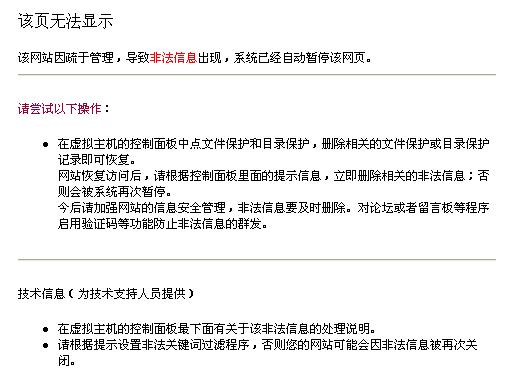 如果您的網(wǎng)站因管理不善多次出現(xiàn)非法信息或者出現(xiàn)重大非法信息,虛擬主機會被管理員關(guān)閉,