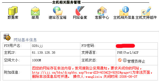 提示: 如果案情特殊的,公安部門會直接通知我司永久關(guān)閉該空間,這類網(wǎng)站會在附加信息中注明“永久關(guān)閉”。這種網(wǎng)站不能再開了。