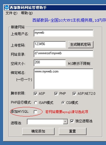 2、雙擊桌面上的“三五互聯(lián)網(wǎng)站管理助手”,打開(kāi)管理助手: 首先設(shè)置上傳用戶(hù)名、密碼,網(wǎng)站目錄會(huì)自動(dòng)生成。空間大小若不想限制,請(qǐng)?jiān)O(shè)置為0.綁定域名的時(shí)候,每一行填寫(xiě)一個(gè),為了您網(wǎng)站的安全,請(qǐng)勾選您網(wǎng)站所屬的腳本。如您的網(wǎng)站是PHP程序,建議只勾選PHP。在PHP運(yùn)行模式此處,如果是discuz論壇或者康盛創(chuàng)想的程序,請(qǐng)選擇ISAPI模式,CGI模式有可能造成程序不穩(wěn)定。如果需要mysql數(shù)據(jù)庫(kù),請(qǐng)勾選“添加MYSQL”,再點(diǎn)確認(rèn)添加就可以了。做完這些,已經(jīng)完成了一半的工作啦。 3、接下來(lái)就是最重要的步驟了。 首先、回到我們網(wǎng)站的管理中心—業(yè)務(wù)管理—主機(jī)租用管理。