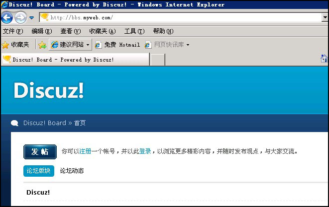 至此新建子站的過(guò)程就結(jié)束,可以用您的子站域名如:bbs.myweb.com來(lái)訪問(wèn)測(cè)試下,如圖:
