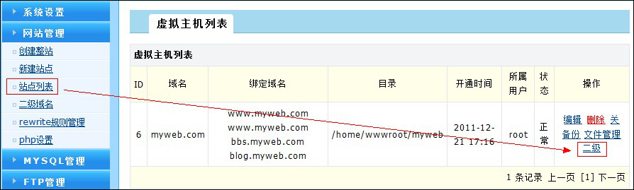 最后點擊確定,就建立好了一個二級域名的站點。 wdcp3.2版本: 首先登錄WDCP管理面板,點擊左側的“網(wǎng)站管理”——“站點列表”,在站點列表選擇您要綁定二級域名的站點,點擊右側的“二級”,如圖: