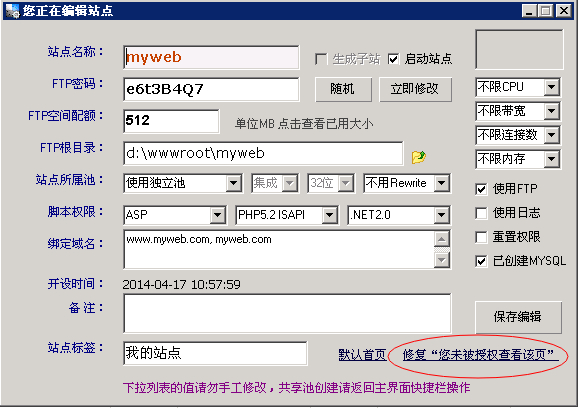 出現(xiàn)以上錯(cuò)誤是因?yàn)榫W(wǎng)站文件上傳后,網(wǎng)站文件的權(quán)限不足造成的。打開(kāi)網(wǎng)站管理助手,雙擊有問(wèn)題的站點(diǎn),或選擇該站點(diǎn)點(diǎn)擊