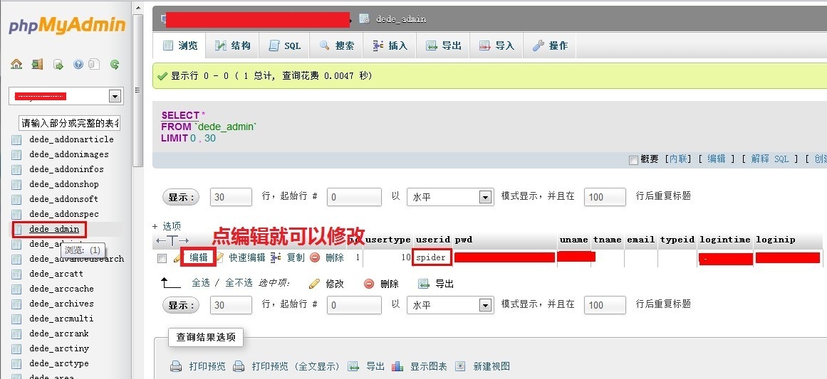登陸以后查看dede_admin表里面的用戶是否被篡改為spider 點擊編輯,直接將spider修改為您需要的管理員,pwd替換為962ac59075b964b07152,這個密碼是123,更改以后請及時登陸網(wǎng)站后臺進行修改密碼。