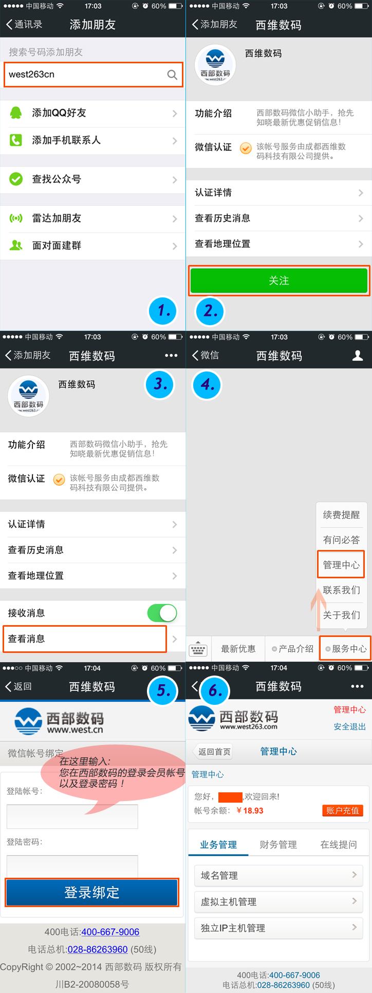 方法二:手工添加綁定。(不推薦,這樣添加的微信無法接收續(xù)費(fèi)通知和驗(yàn)證碼等消息) 問題:綁定錯(cuò)了,需要修改/取消關(guān)注怎么辦?