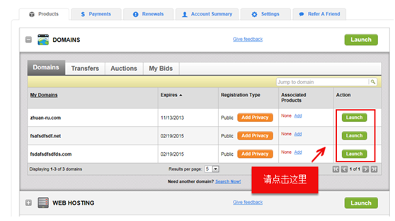 3、展開域名列表后,找到需要修改DNS的域名,點擊對應(yīng)的【Launch】按鈕。