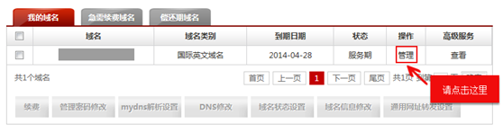 2、在域名管理頁面找到要修改DNS的域名,點擊【管理】 3、打開頁面后,點擊【域名管理】