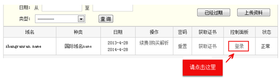 3.進(jìn)入域名管理頁后,在頁面右側(cè)下方找到修改DNS的域名,并點擊【登錄】,登錄控制面板。
