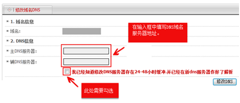5、在輸入框中填寫域名DNS服務(wù)器地址,并勾選“我已經(jīng)知道……”協(xié)議后點(diǎn)擊【修改DNS】按鈕。