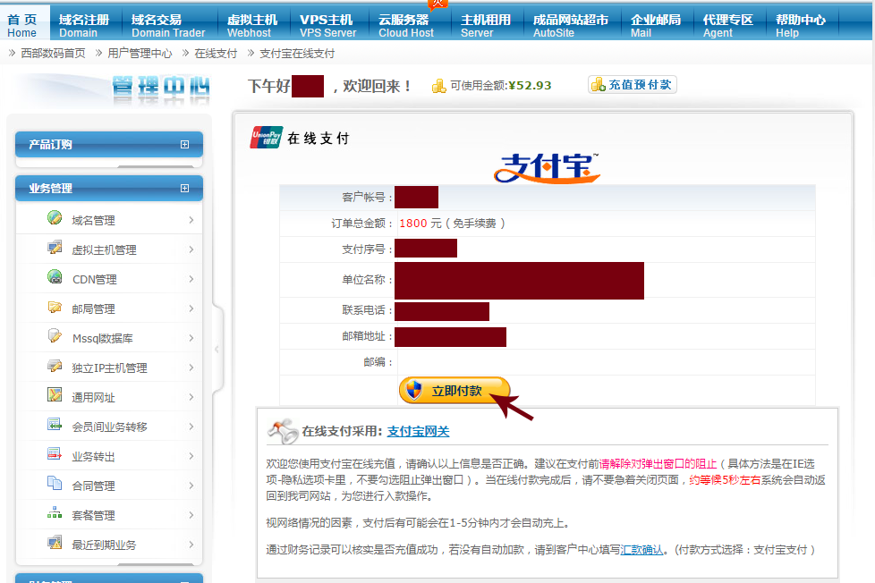2.確認(rèn)訂單,并立即支付!如下圖所示!