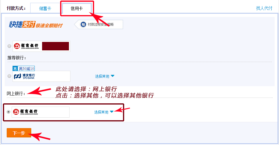4.選擇信用卡選項(xiàng),選擇網(wǎng)上銀行,并選擇對應(yīng)的銀行!如下圖所示!