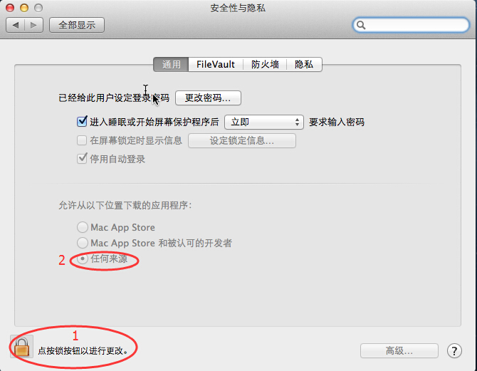 若安裝時(shí)提示“您的安全性偏好設(shè)置僅允許安裝來自 Mac App Store 和被認(rèn)可的開發(fā)者的應(yīng)用程序。” 請(qǐng)依次打開“系統(tǒng)偏好設(shè)置”——“安全性與隱私”。點(diǎn)擊左下角的鎖,輸入管理員密碼解鎖后, 在“允許從以下位置下載的應(yīng)用程序”后選擇“任何來源”,即可正常安裝該軟件。如圖: