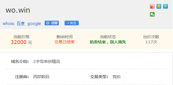 17.win可以解釋為“一起贏”本身是一個(gè)兩位數(shù)保留域名,拍賣過(guò)程中經(jīng)過(guò)了88次競(jìng)價(jià),最終拍出46000元。wo.win可以理解為“我贏”,是一個(gè)兩字母域名,經(jīng)過(guò)117次競(jìng)價(jià),最終拍出32000元。